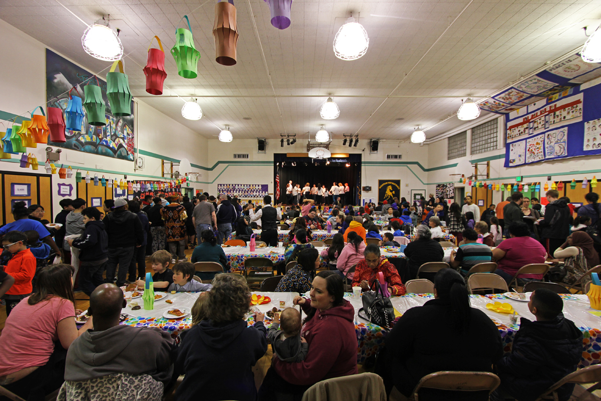Neighborhood organizations and school business partners set up tables in the building’s main corridor, and families snapped photos in a “selfie booth” by the front door. Dinner — everything from kalawele, sambusak and enchiladas to chicken pad thai, frybread and smoked salmon — was provided by 11 local businesses and community members.
