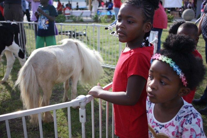 Girls visit the petting zoo at Mountain View’s National Night Out block party.